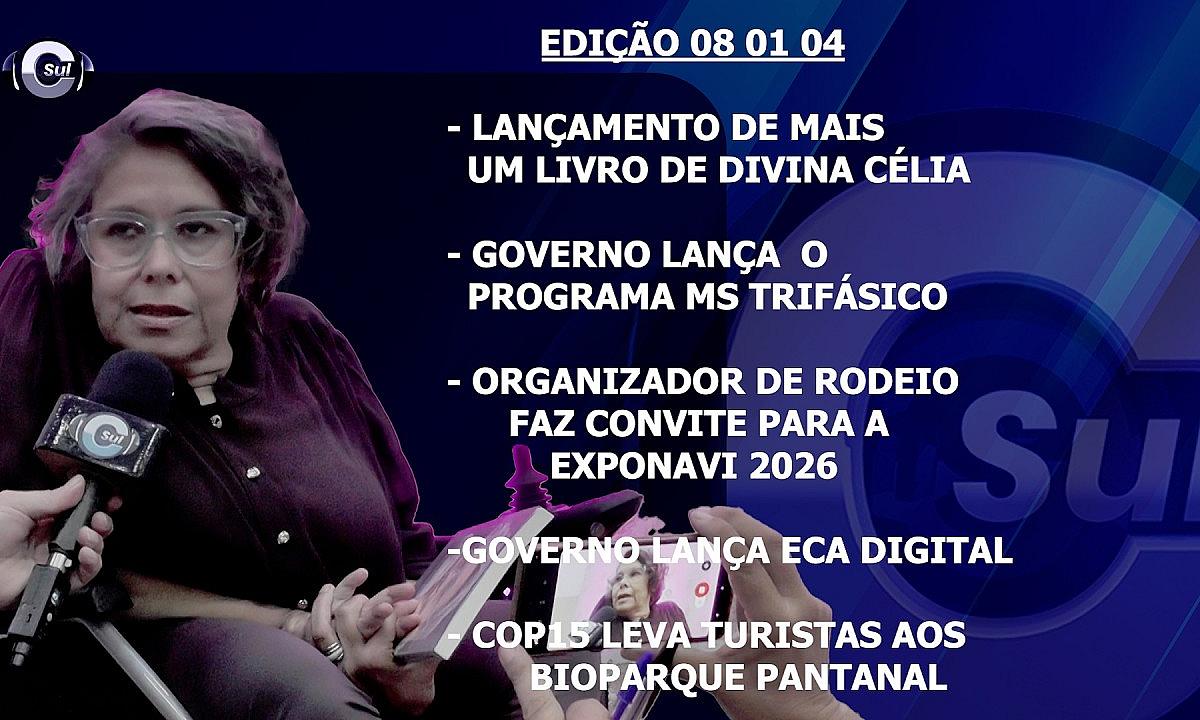 Veja nesta edição como foi o lançamento de mais uma livro da escritora naviraiense Divina Célia, Governo do Estado lança a campanha MS Trifásico, Membro da Comissão de rodeio faz convite para a Exponavi 2026, Governo Federal lança ECA Digital e participantes do COP 15 visitam o Bioparque -Várias entrevistas